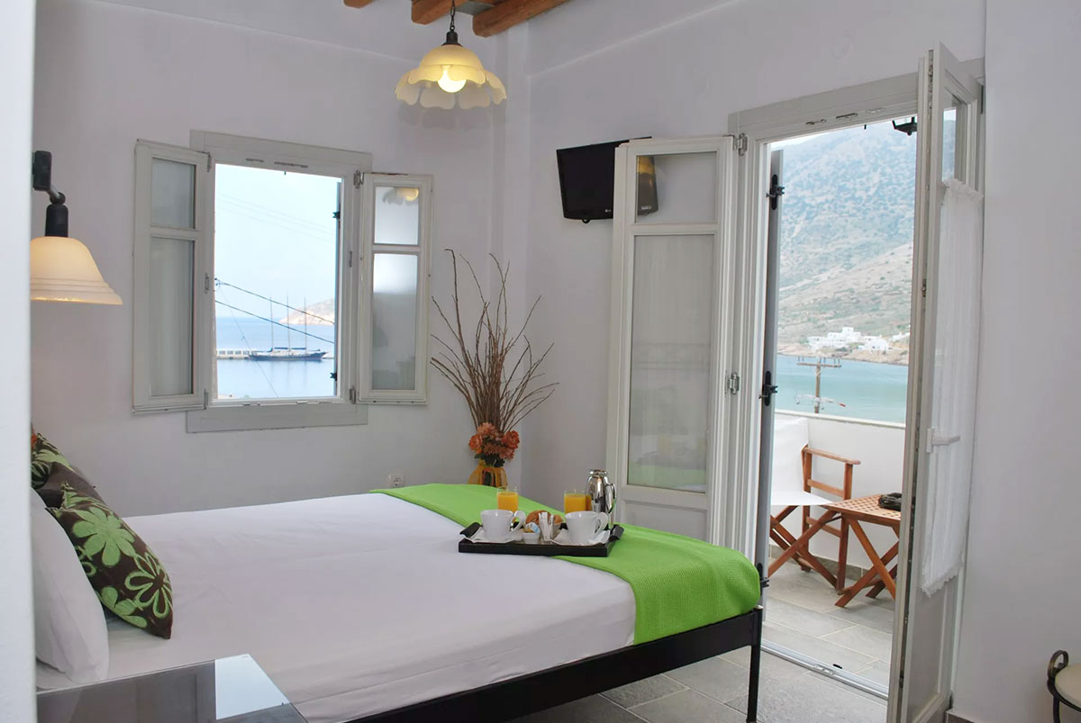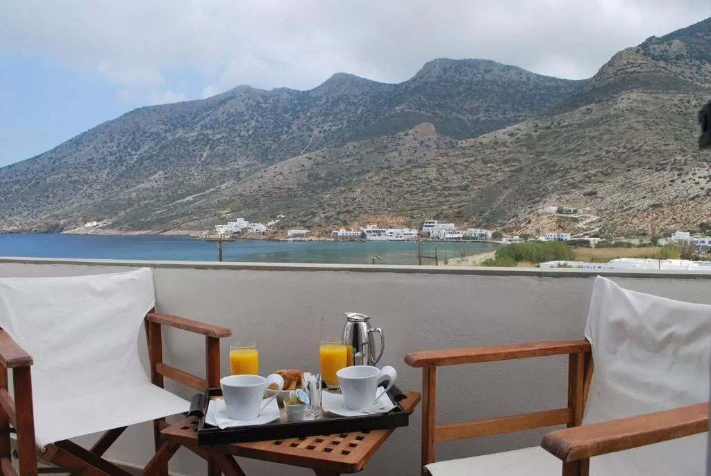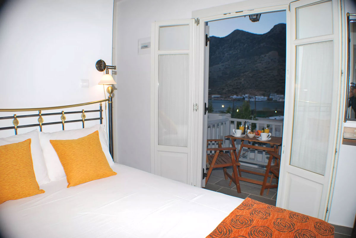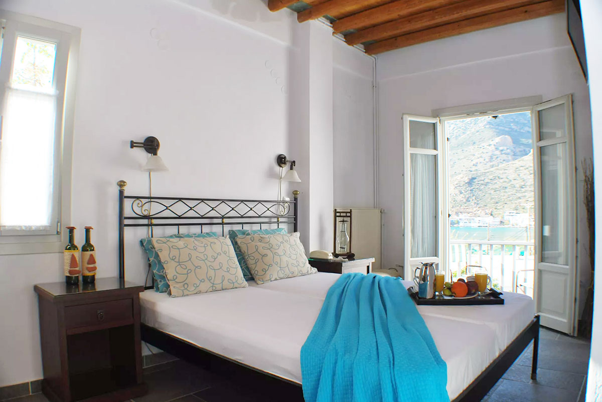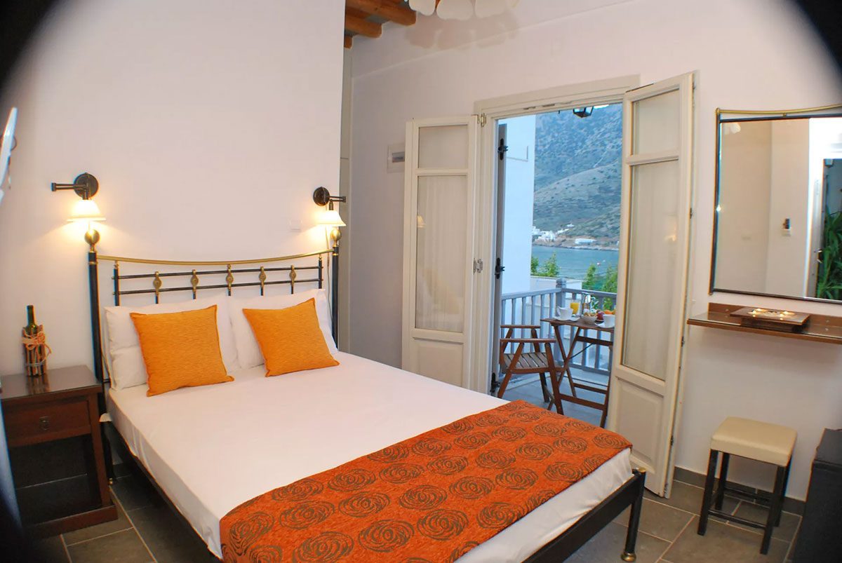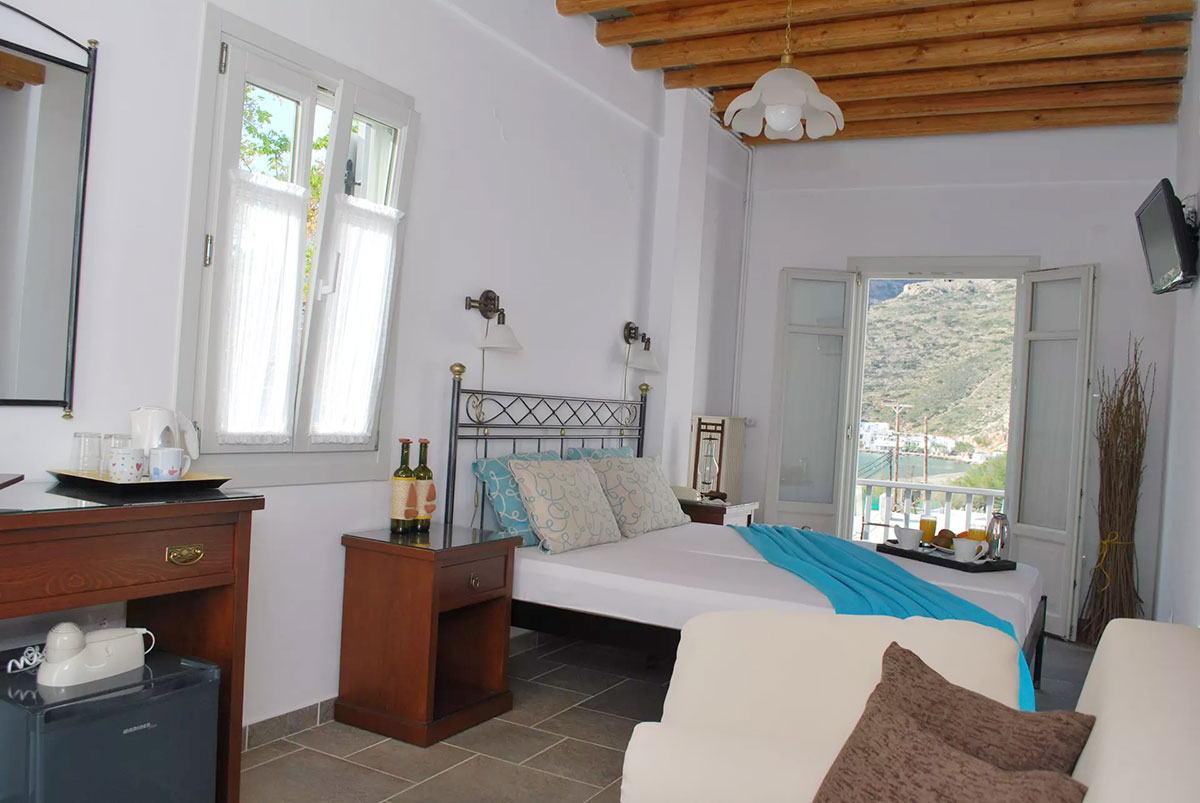 Entrez dans une chambre baignée par la lumière cycladique et détendez-vous sur le balcon à la vue merveilleuse sur la baie de Kamares, en contemplant la mer et la plage, surtout au coucher du soleil!