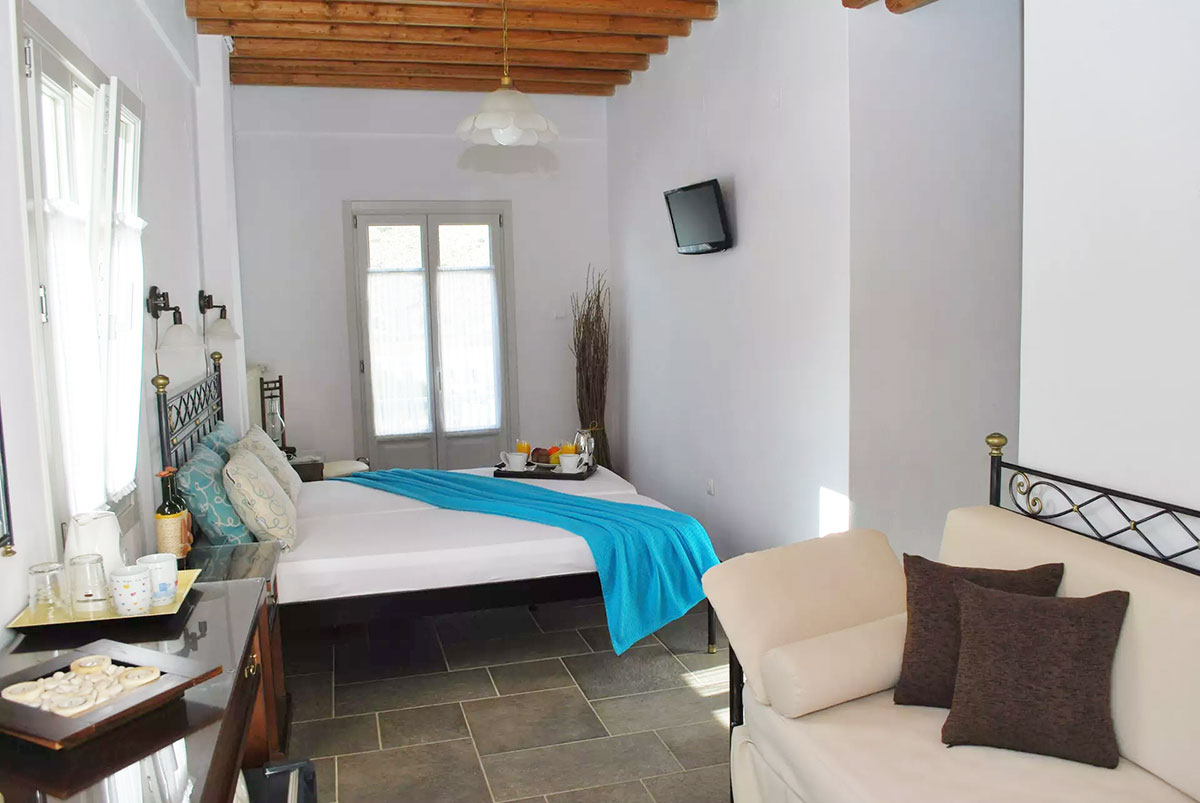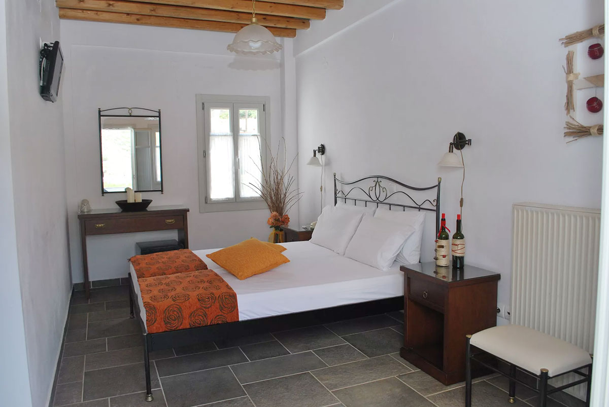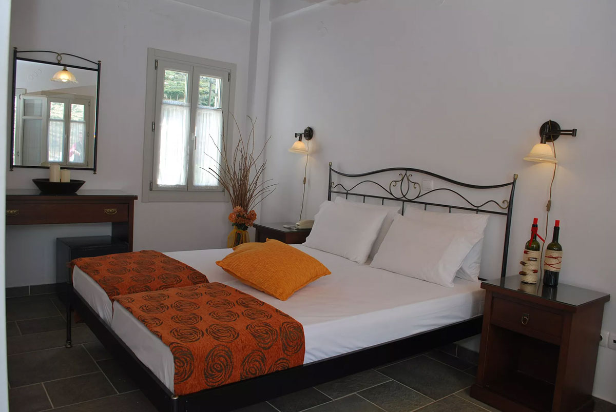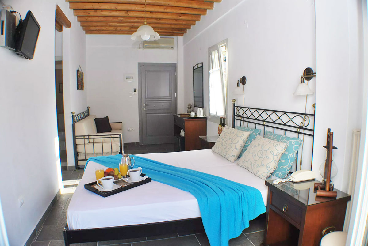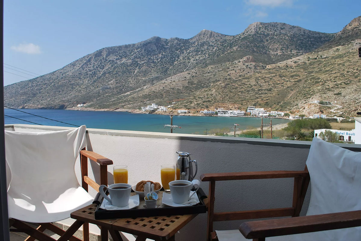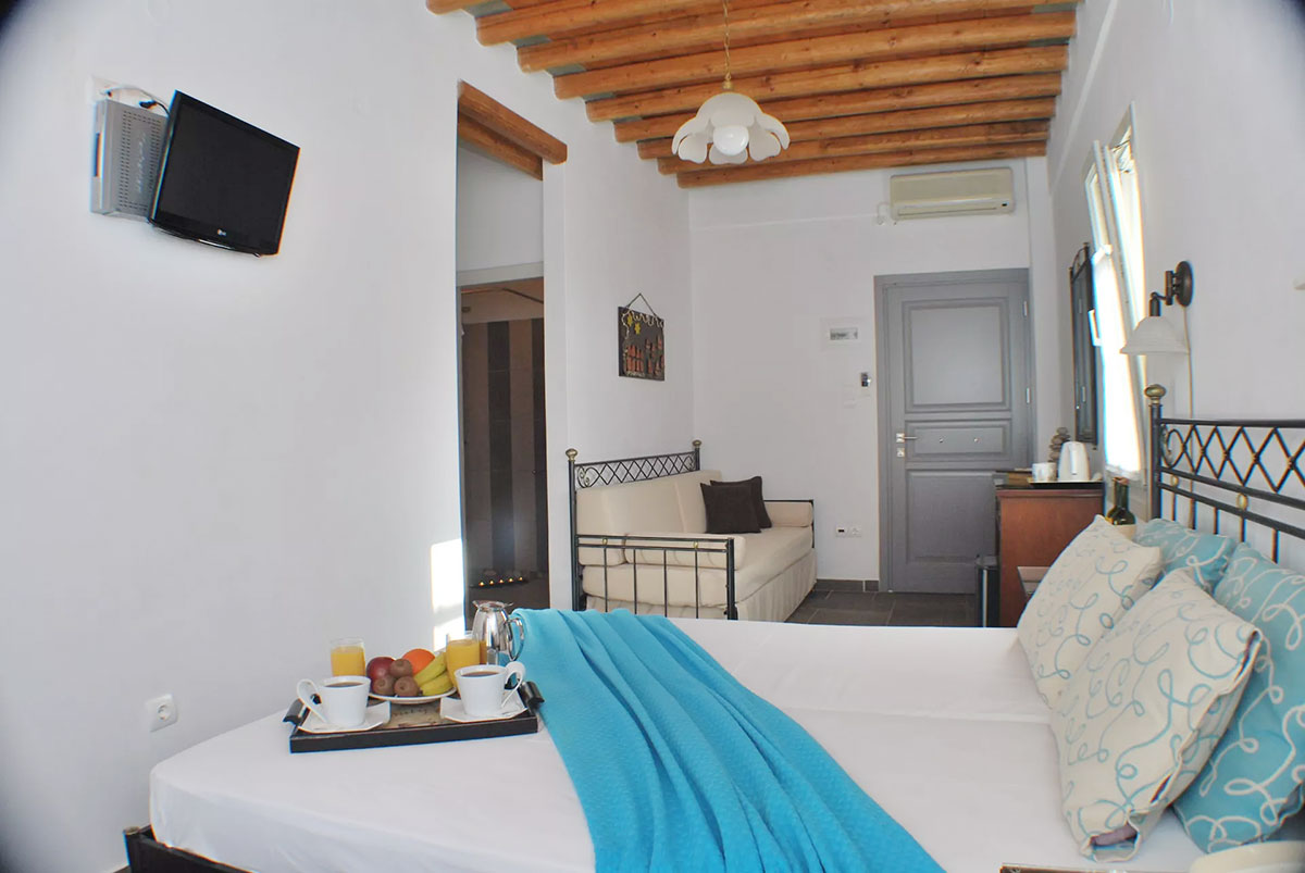 Entrez dans une chambre baignée par la lumière cycladique et détendez-vous sur le balcon à la vue merveilleuse sur la baie de Kamares, en contemplant la mer et la plage, surtout au coucher du soleil!