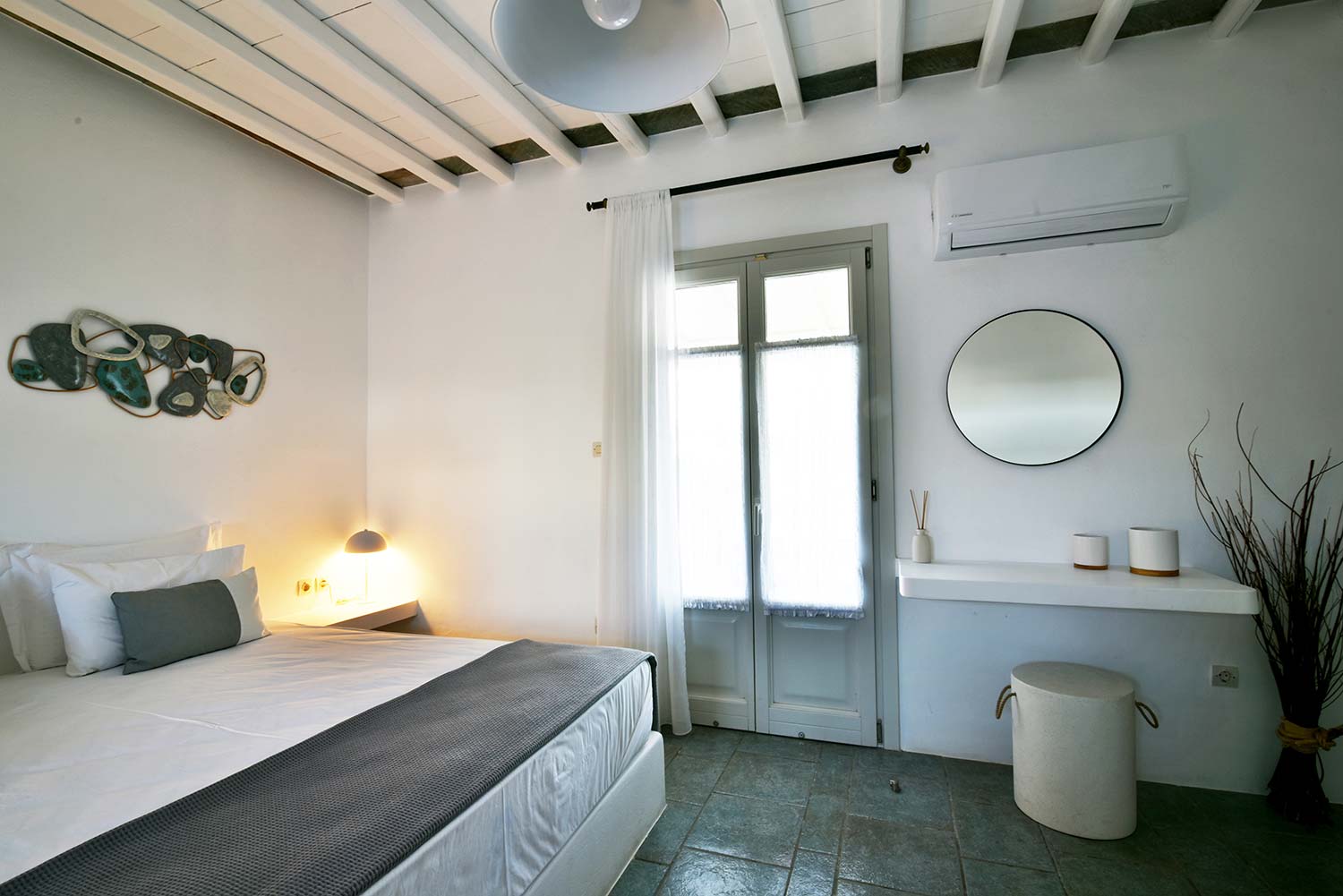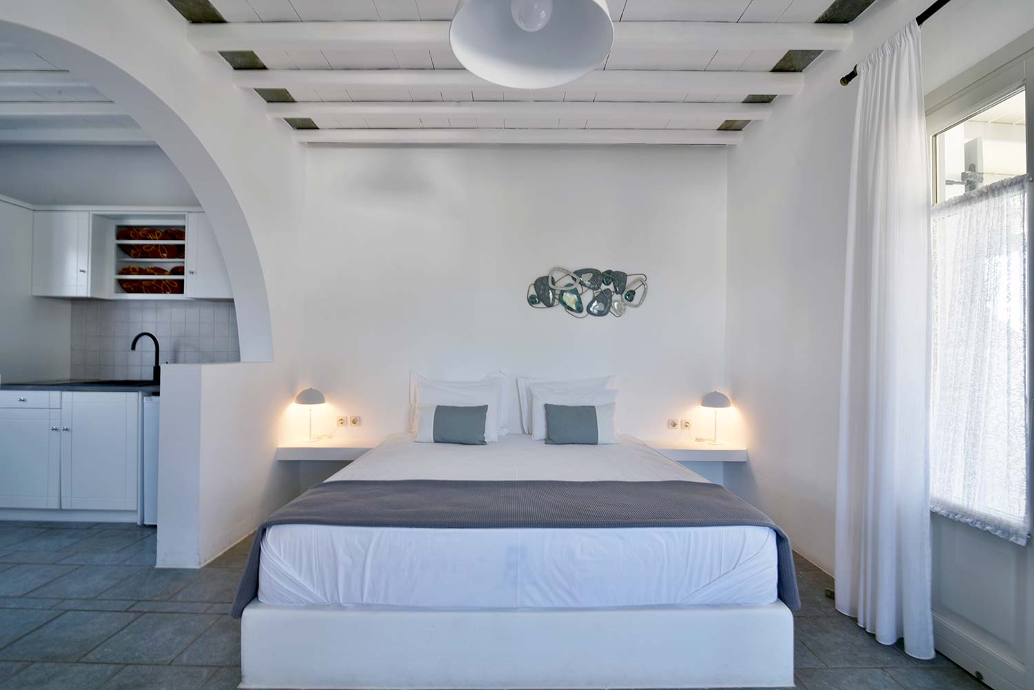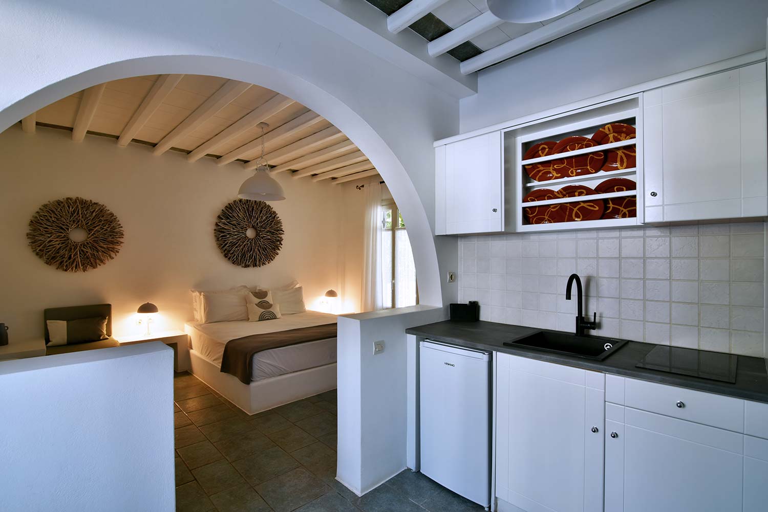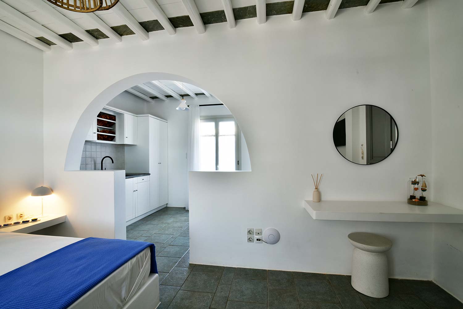 the stone-built bed and sofa, the modern bathroom and the well-organized kitchen make this apartment particularly practical,