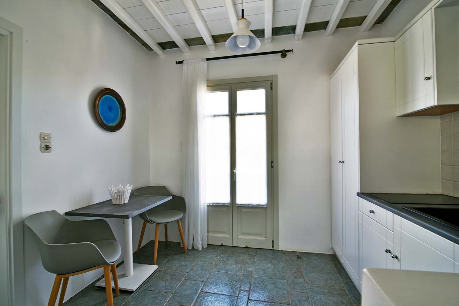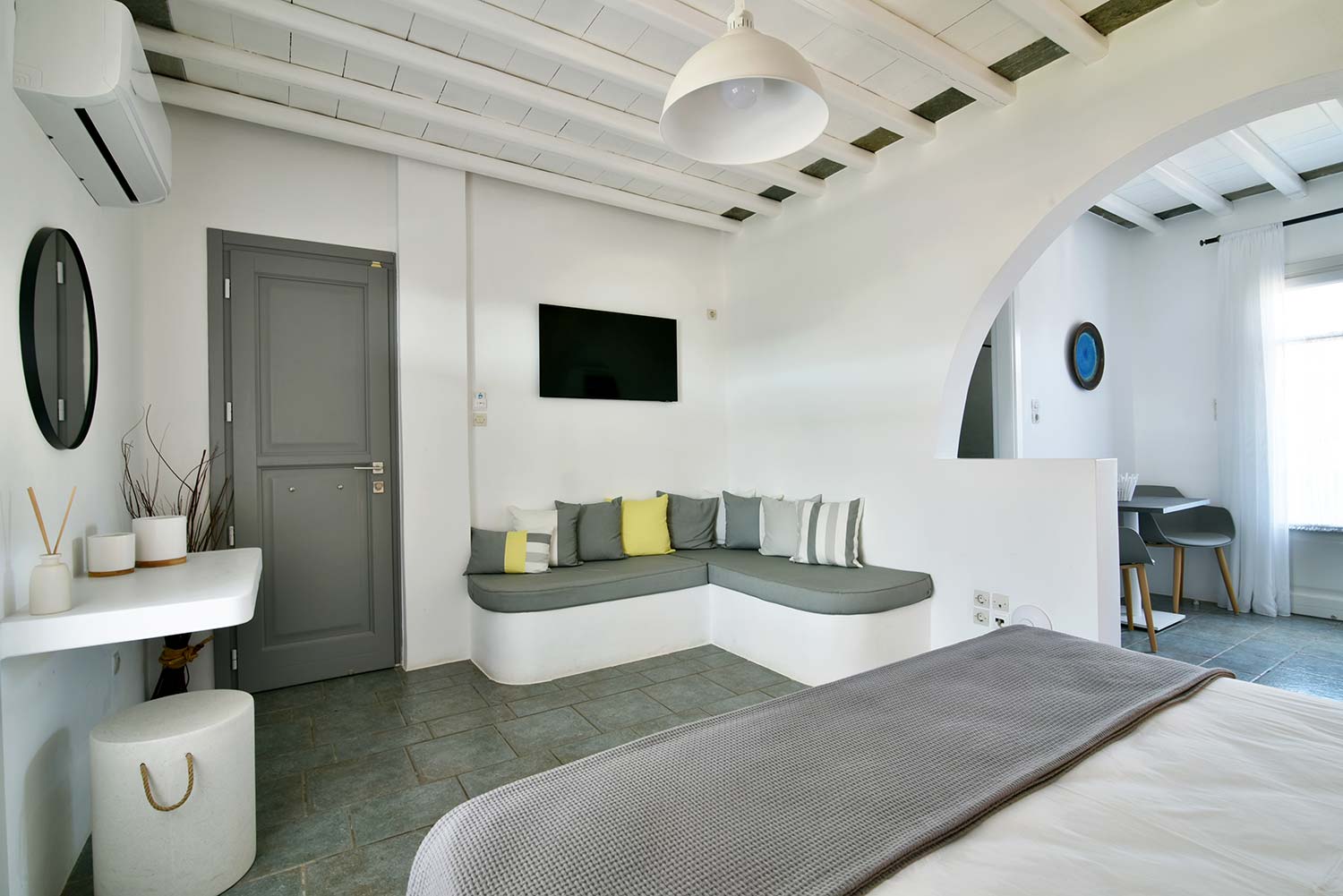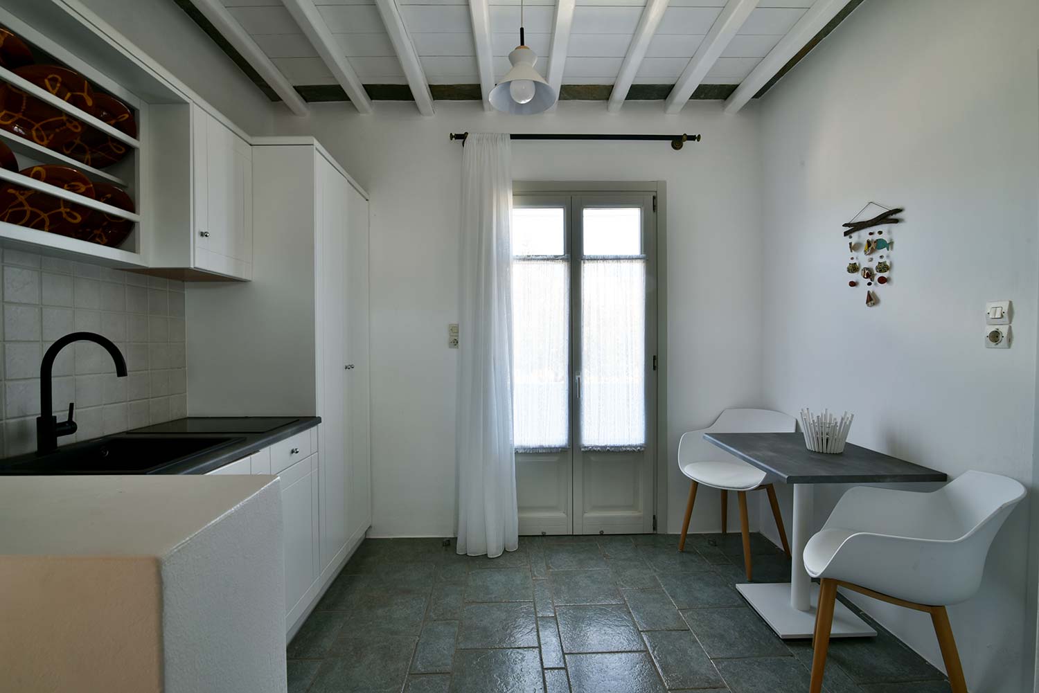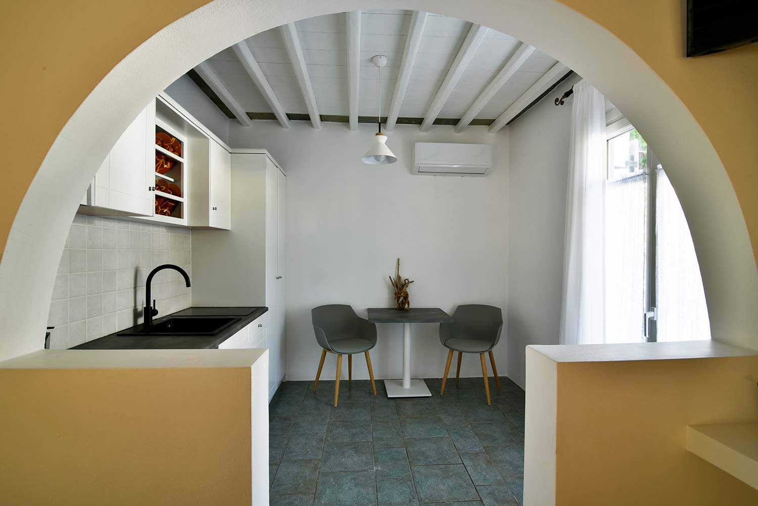 the stone-built bed and sofa, the modern bathroom and the well-organized kitchen make this apartment particularly practical,