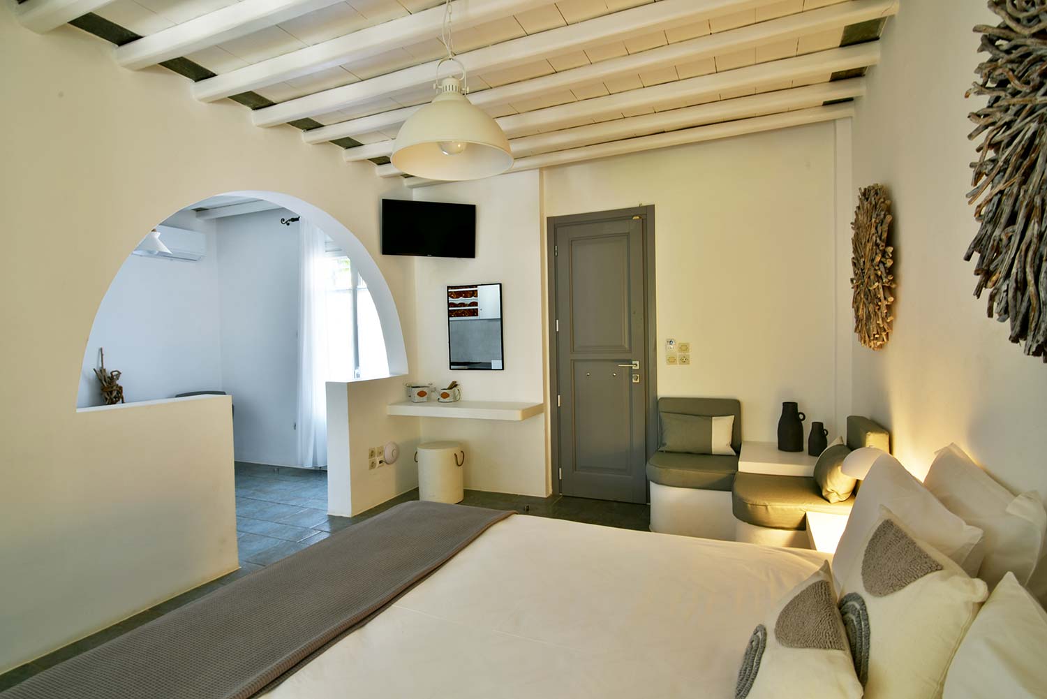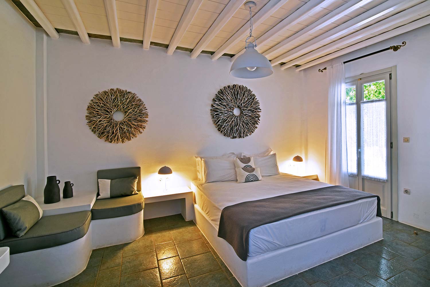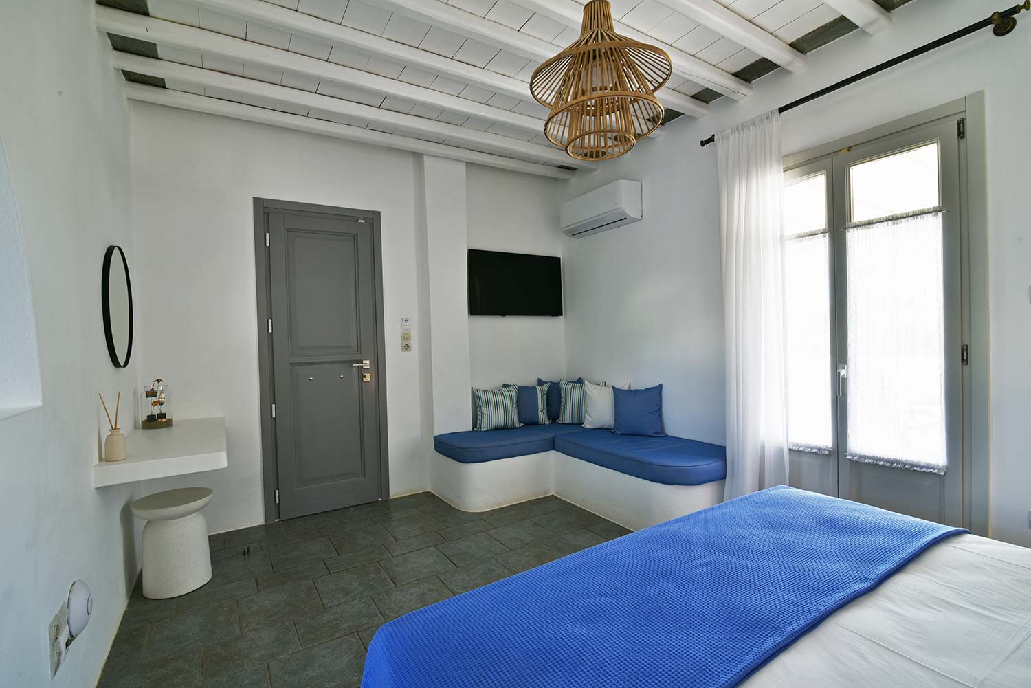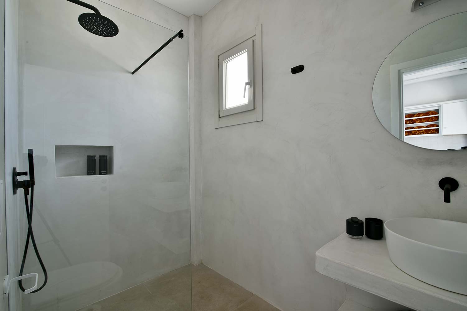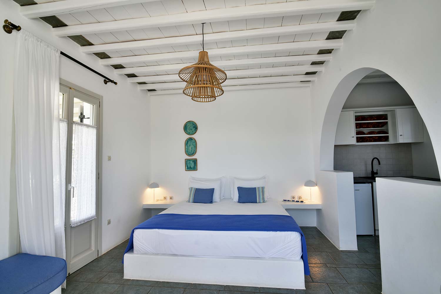 the stone-built bed and sofa, the modern bathroom and the well-organized kitchen make this apartment particularly practical,