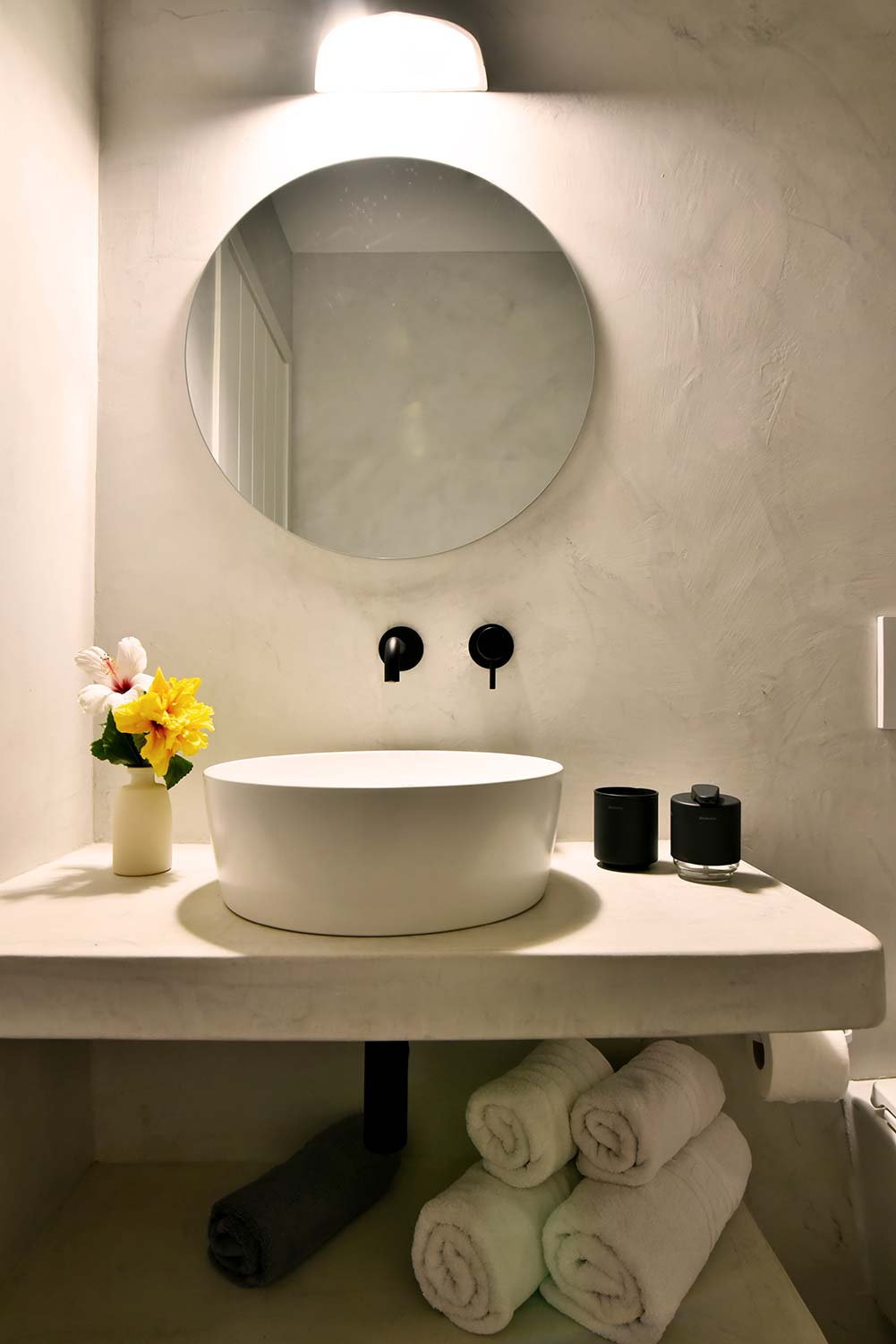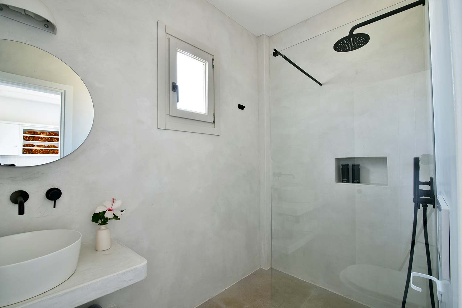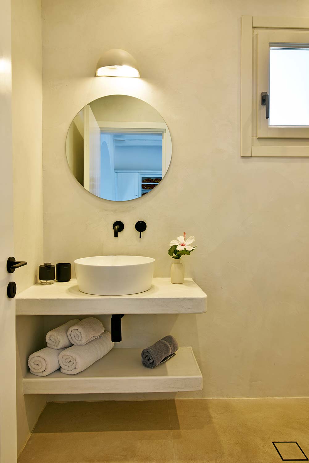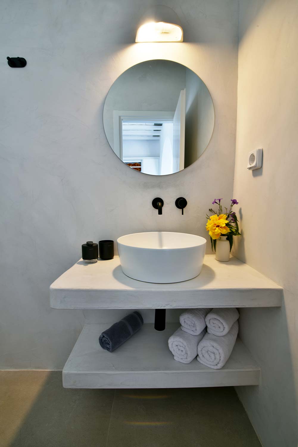 the stone-built bed and sofa, the modern bathroom and the well-organized kitchen make this apartment particularly practical,